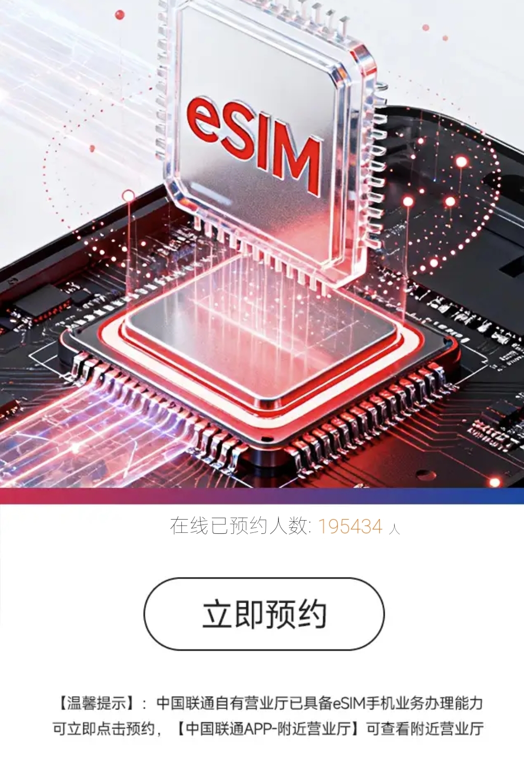 用户预约开通eSIM业务的热情较为高涨。iPhone Air是国内首款支持eSIM的智能手机。记者在中国联通网站看到,截至17日下午1点,联通eSIM在线预约人数已达19.5万人。